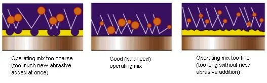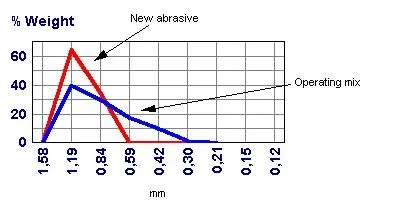 Parçacıklar çeşitli aşınma derecelerinden geçtiği için, çalışma karışımının boyut dağılımı yeni aşındırıcınınkinden çok farklıdır, ancak aynı nominal boyuta sahiptir: