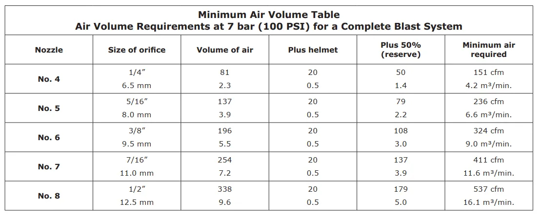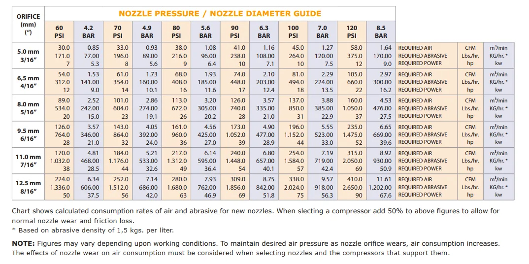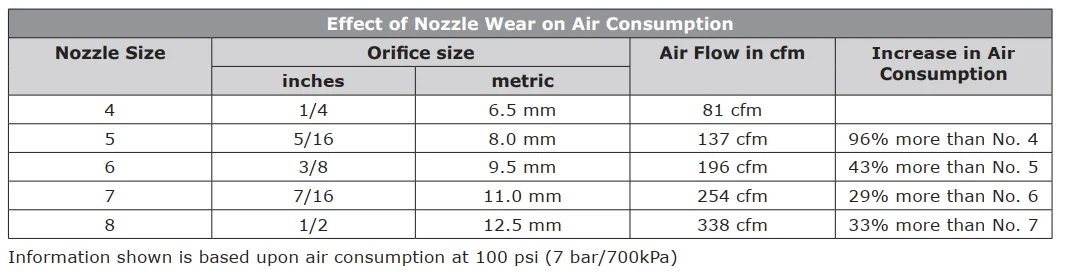 Memeler, yüksek hızlı medyaya sürekli maruz kalmaktan aşındıkça, delikten daha fazla hava ve medya geçmesine izin verir. Sonuçta memenin içindeki daha büyük alan, daha fazla hava hacmi tüketir ve sıkıştırılmış hava kaynağına daha fazla yük bindirir. Artan akışa hava hacmi yetişemezse, memedeki basınç düşer. Basınç azaldıkça shot peening yoğunluğu ve verimlilik düşer, etkinlik azalır. Sürekli yüksek üretim sağlamak için genel bir kural olarak, delik bir sonraki büyük boyuta aşındığında memeyi değiştirmektir.