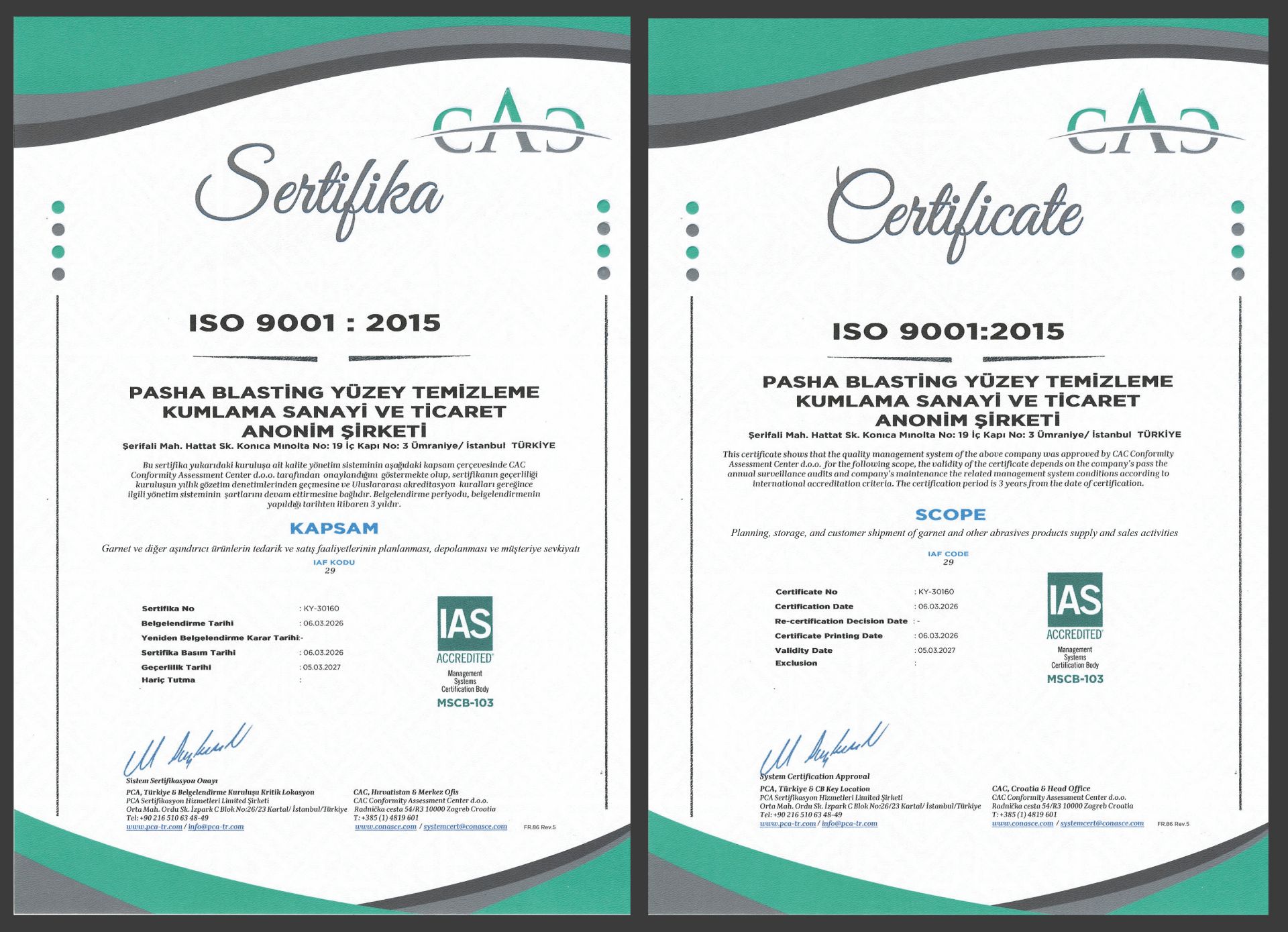 Pasha Blasting olarak, yüzey temizleme ve kumlama sektöründeki uzmanlığımızı ISO 9001:2015 Kalite Yönetim Sistemi sertifikası ile taçlandırdık. Planlamadan sevkiyata kadar her aşamada uluslararası standartları uyguluyor, süreçlerimizi sürekli iyileştiriyoruz.